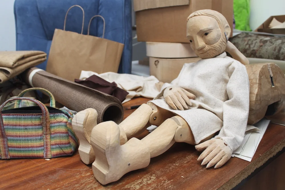 I started prepping for the tutorials by prototyping the style of puppet. I knew I wanted to teach marionette making, but I needed to find a simple solution that would appeal to beginner and intermediate carvers. My mentor John Roberts suggested the idea of rod marionettes and the ideas evolved from there…